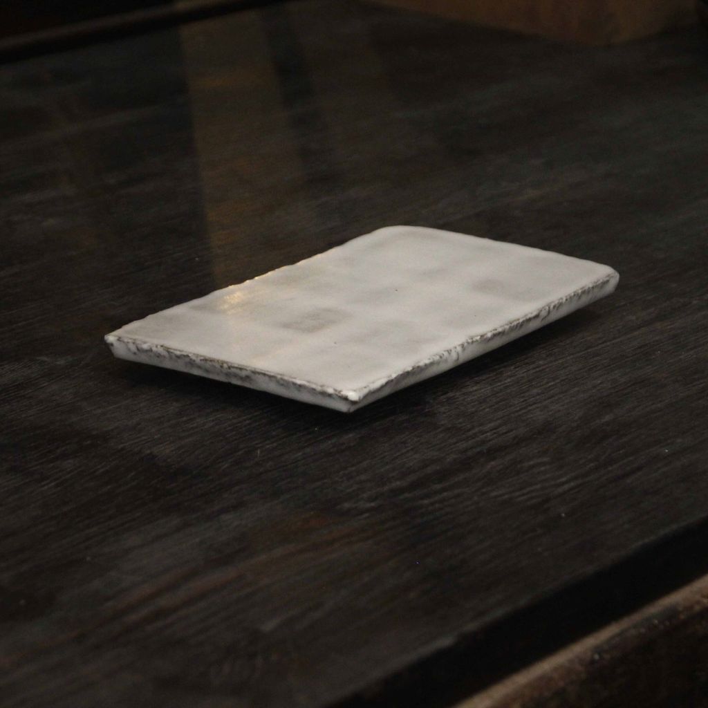 • 釉色呈現純白色,釉薄處自然透著底部的咖啡陶土色,以十字刷紋施釉,所以有交疊的施釉痕跡,擺放小食與甜點很適合。